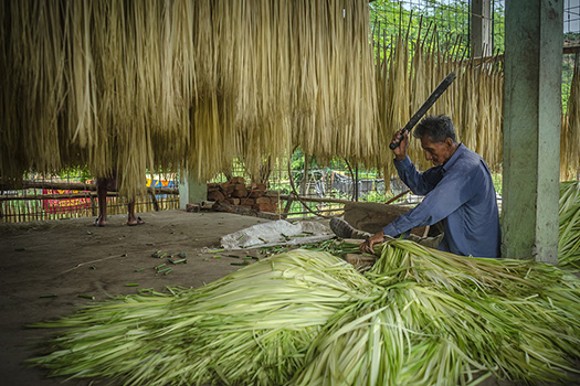 De la planta se cortan los “cogollos”, es decir, las hojas en formación antes de que conviertan en palmas. Para esto deben tener al menos 60 centímetros de largo y un color verde oscuro. Luego se golpean contra el suelo para que se abran como un abanico, se separan manualmente las partes verdosas que se encuentran en el medio y los extremos. Con un picador (especie de peine) se rasgan hasta sus extremos dividiéndose en muchas fibras delgadas donde otra vez se separan manualmente las fibras de color crema de las fibras amarillas-verdosas. Luego los cogollos se agrupan de a 6 formando enrollados.
