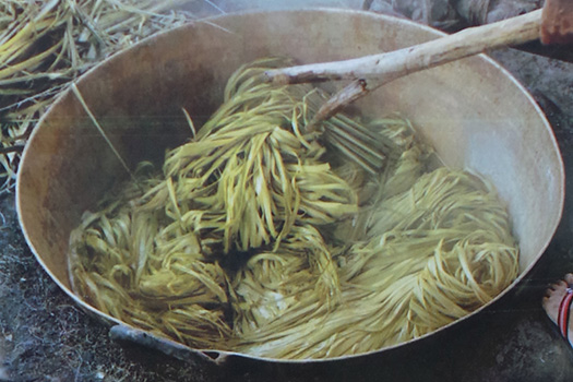 Cada enrollado de cogollos se introduce en una olla de aluminio con agua hirviendo por alrededor de 15 minutos. Dicha olla es calentada con leña, carbón y azufre, y se cuida de que el humo no malogre la coloración natural de las fibras, ya que este es el procedimiento que quita el color verde de las pajas.